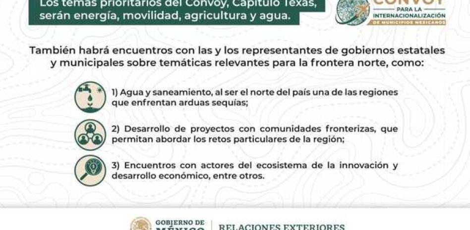 La agenda, que se desarrollará a partir de este lunes 17 y hasta el próximo viernes 21 de la semana que inicia, fue generada a partir de la identificación de necesidades y potencial de cada uno de los municipios y estados representados, y priorizará temáticas que se consideran relevantes para los municipios de la frontera norte del país, como: I) agua y saneamiento, al ser el norte del país una de las regiones que han enfrentado arduas sequias en los últimos meses, e incluso años; II) desarrollo de proyectos con comunidades fronterizas, que les permitan abordar los retos particulares de la región; III) encuentros con actores del ecosistema de Texas para la innovación y desarrollo económico, entre otros.